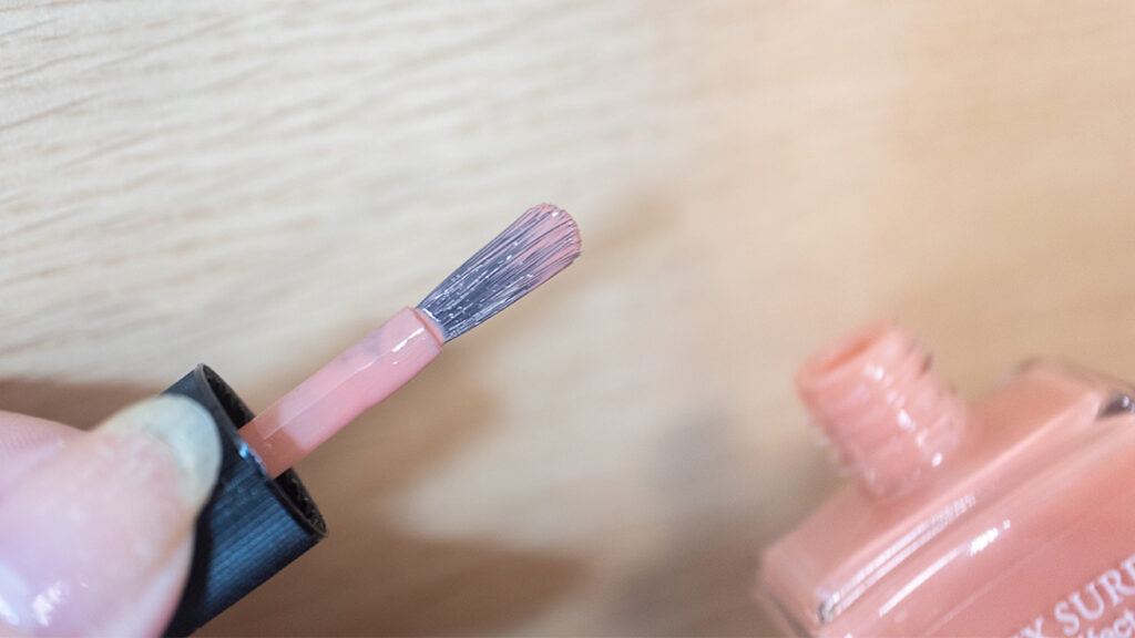 ネイルズインクの筆は大き目の平筆。特許を取得した独自のワイドキューティクルブラシは柔らかめの毛質でネイルポリッシュのふくみがよく1度で爪の広範囲を塗る事が出来るのでムラになりにくいように感じました。
