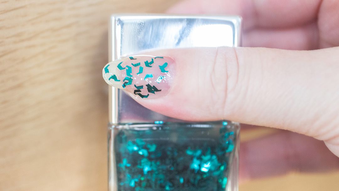 この個性的な形のグリッターはアロエの形なんだそうです。クリアな液の中にブルーのグリッタ―がたっぷり入ったおしゃれなネイルカラー。これだけで仕上げてもきらきらとグリッターが輝いておしゃれな雰囲気ですが別のカラーに重ねてもGOOD!!液のテクスチャーが緩めなのでスポンジなどに取り液を吸わせて爪にポンポンと乗せるとたっぷりグリッターが乗せられるのでそちらの使い方もおすすめ。